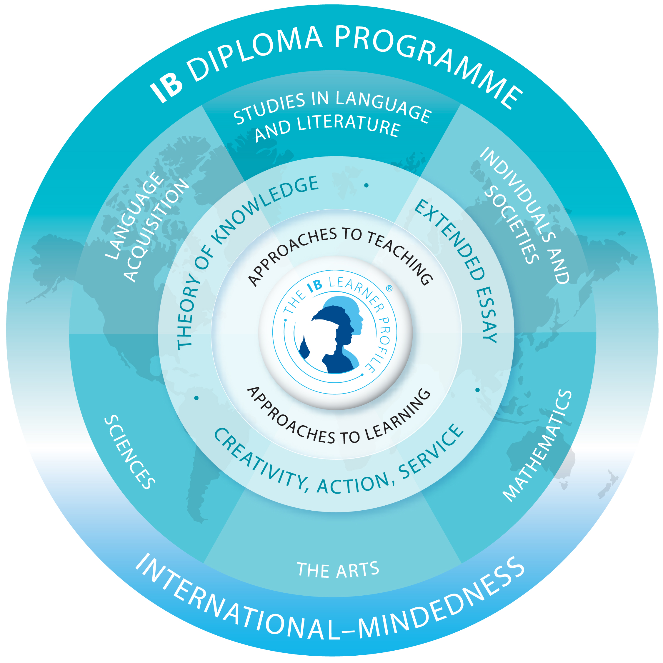 The International Baccalaureate curriculum model consists of six academic subject groups surrounding a core. Students study: